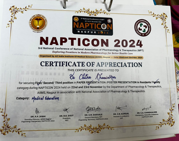 NAPTICON 2024 Organised 3rd National conference of a National association of Pharmacology & Therapeutics(NPT) Certificate is present to Dr. Chitra Khanwelkar for securing 1st position in paper presentation.