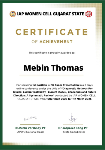 Dr. Mebin Thomas (MPTh 1), Musculoskeletal Sciences Physiotherapy, secured 1st rank in Paper presentation, Postgraduate (PG) category, showcasing outstanding academic excellence and presentation skills.