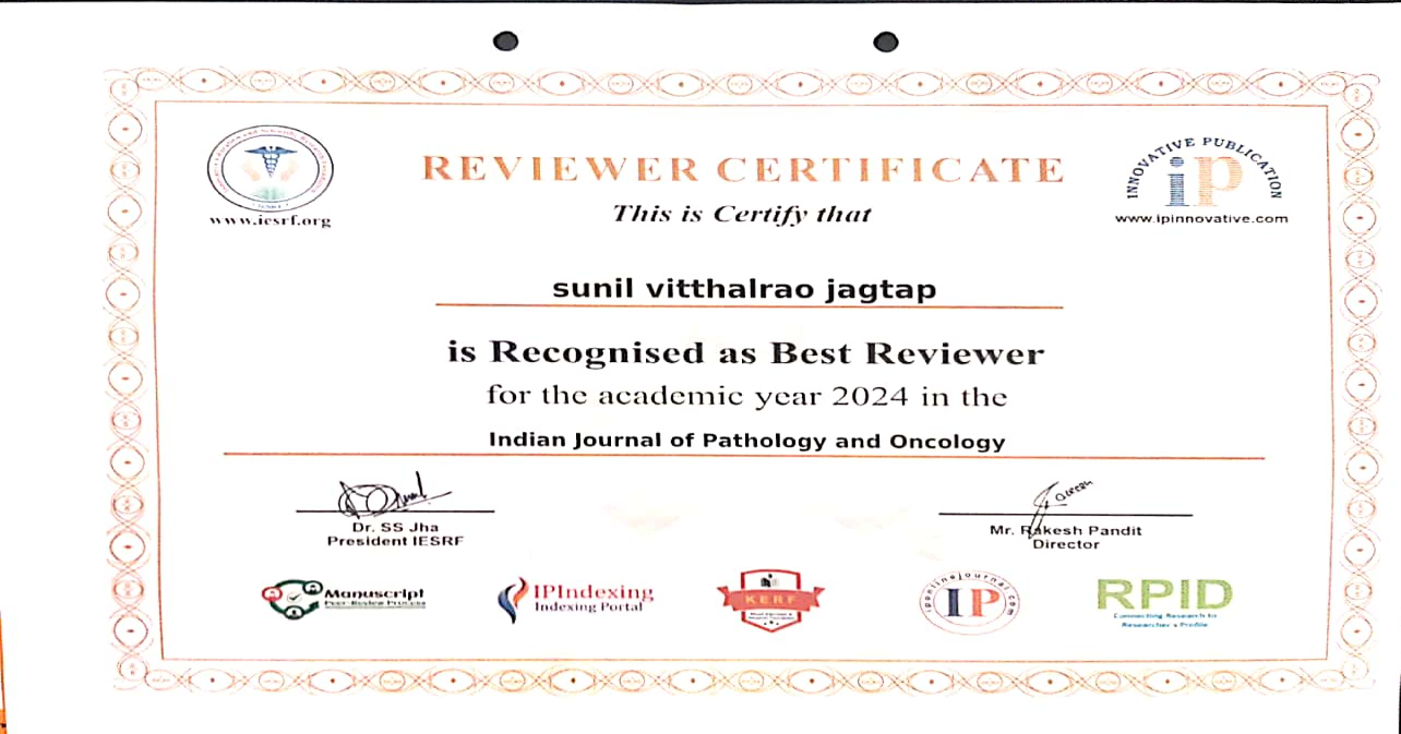 We are proud to announce the significant contributions of Dr. Sunil Vitthalrao Jagtap to the Indian Journal of Pathology and Oncology during the academic year 2024.