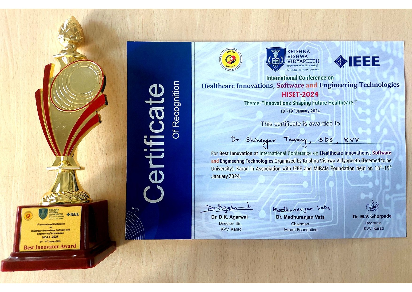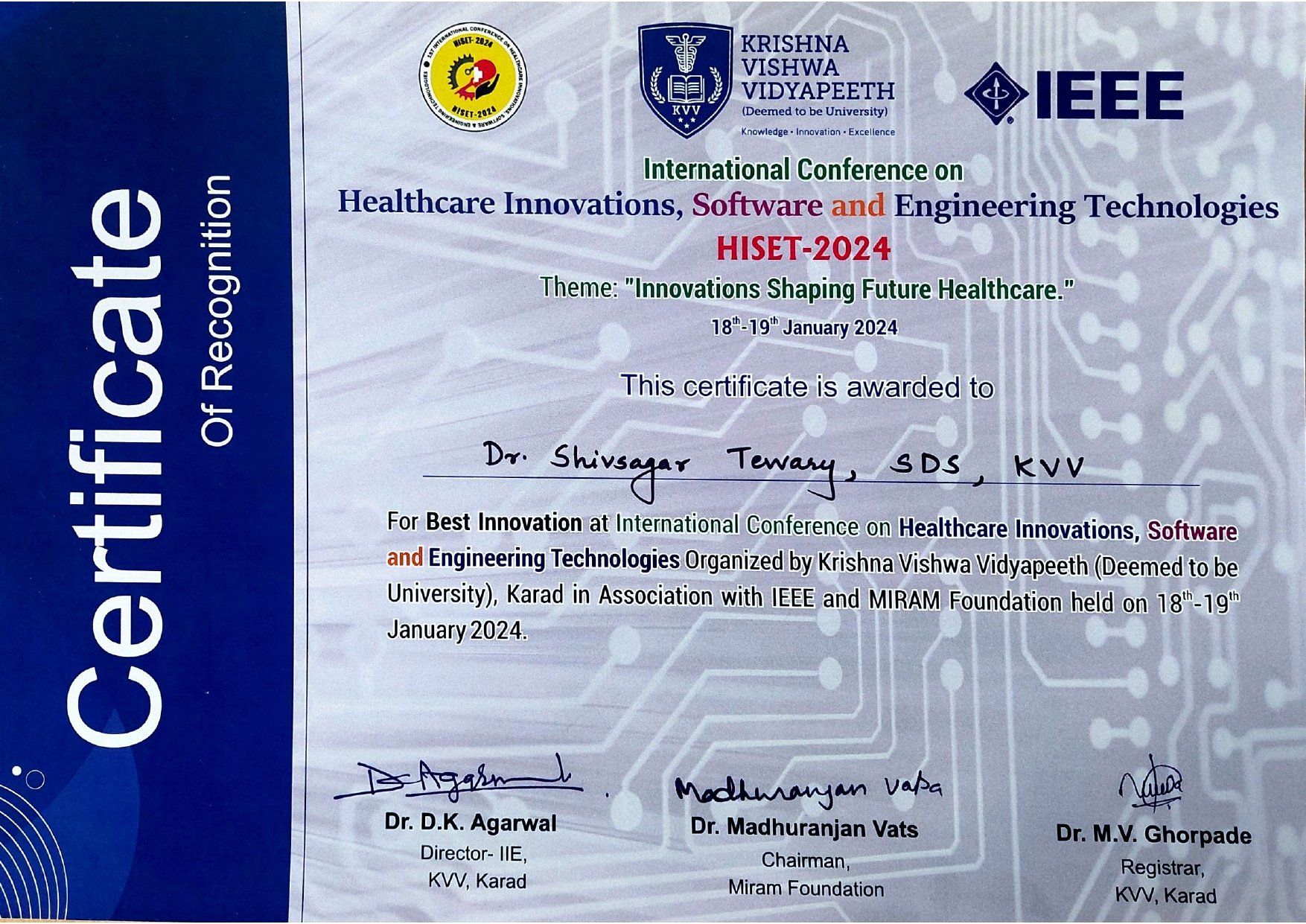 Shivsagar Tewary,Associate Professor,Dept.of Prosthodontics,School of Dental Sciences,Krishna Vishwa Vidyapeeth has been awarded with“BestInnovation” at International Conference on Healthcare Innovations,Software andEngineeringTechnologies (HISET) organized by Krishna Vishwa Vidyapeeth,Karad in association with IEEE and MIRAM foundation held on18-19th January2024.