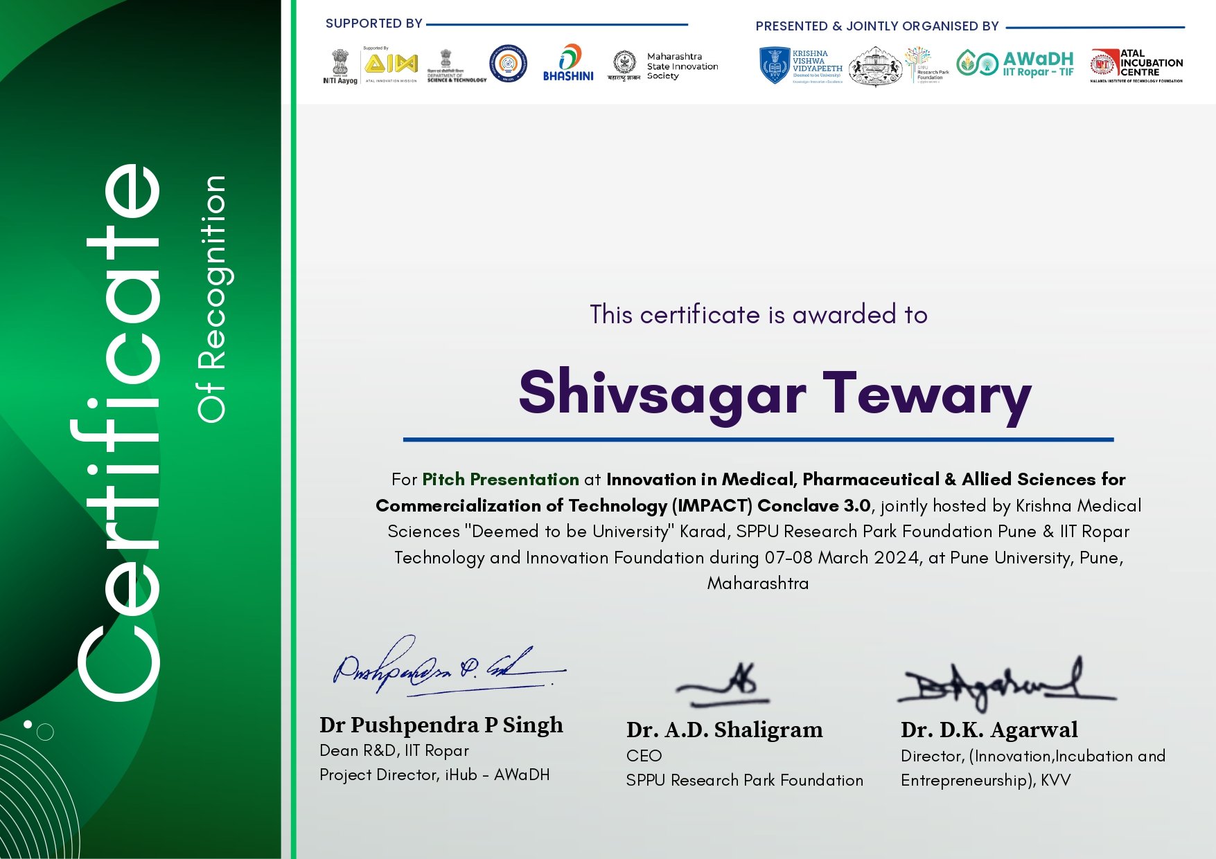 Shivsagar Tewary, Associate Professor, Dept.of Prosthodontics, School of Dental Sciences,Krishna Vishwa Vidyapeeth has been awarded with “BestPitch Presentation” atInnovation in Medical,Pharmaceutical & Allied Sciences for Commercialization of Technology (IMPACT)Conclave3.0, co-hosted by IIT Ropar Technology and Innovation Foundation,SPPU Research Park Foundation Pune & Krishna Vishwa Vidyapeeth Karad during7th-8thMarch2024at Pune University,Pune.