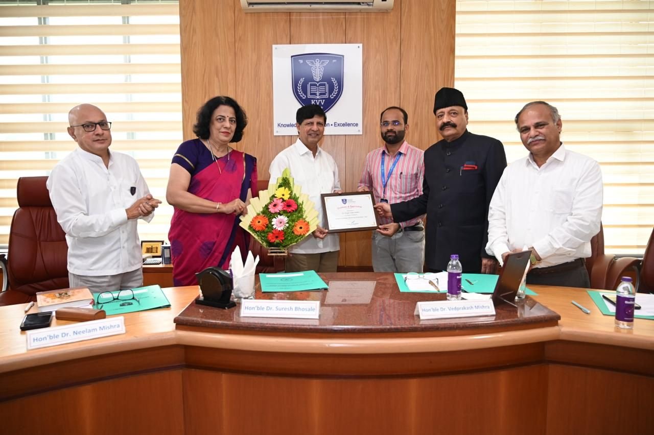 Dr. Nangare was felicitated by Hon’ble Dr. Suresh Bhosale, Chancellor, Krishna Vishwa Vidyapeeth (Deemed to be University), in the esteemed presence of Dr. Vedprakash Mishra, Chief Advisor to Hon. Chancellor; Dr. Pravin Shingare, Principal Advisor (Academics and Accreditation); Dr. (Mrs.) Neelam Mishra, Vice Chancellor; Dr. Balli, UGC Nominee; and Dr. M. V. Ghorpade, Registrar, during the Executive Council Meeting