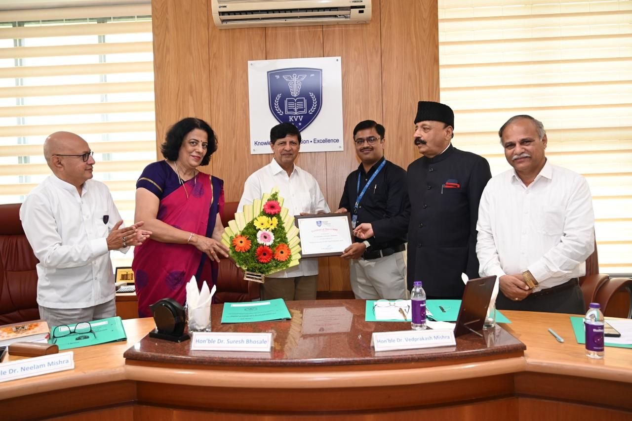 Dr. Ghorpade was felicitated by Hon’ble Dr. Suresh Bhosale, Chancellor, Krishna Vishwa Vidyapeeth (Deemed to be University), in the esteemed presence of Hon’ble Dr. Vedprakash Mishra, Chief Advisor to Hon. Chancellor; Hon’ble Dr. Pravin Shingare, Principal Advisor (Academics and Accreditation); Hon’ble Dr. (Mrs.) Neelam Mishra, Vice Chancellor; and Hon’ble Dr. Balli, UGC Nominee, during the Executive Council Meeting.