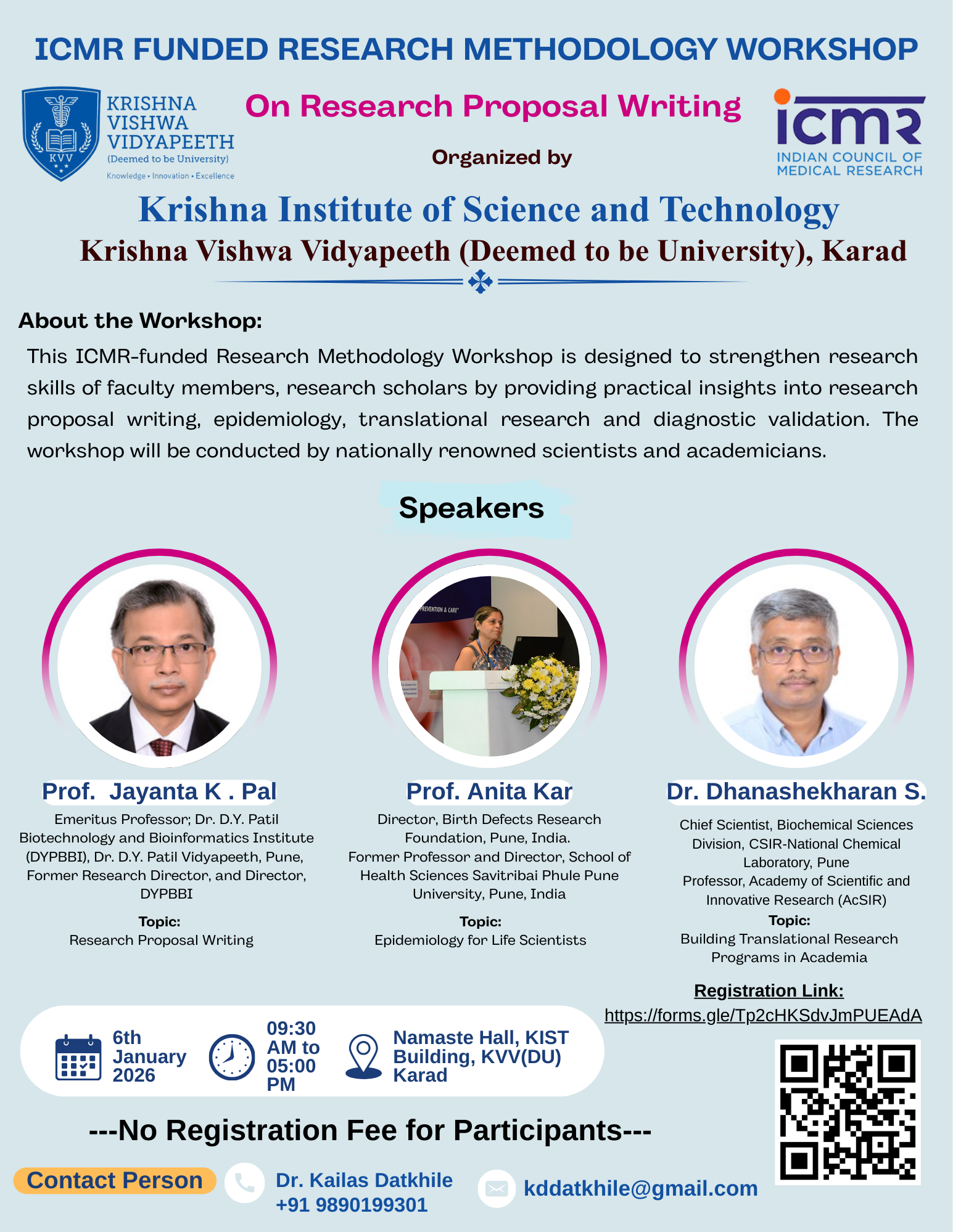 Krishna Institute of Science and Technology (KIST), Krishna Vishwa Vidyapeeth (Deemed to be University), Karad is organizing a one-day ICMR Funded Research Methodology Workshop on “Research Proposal Writing” on 6th January 2026, from 09:30 AM to 05:00 PM at Namaste Hall, KIST Building, KVV (DU), Karad .