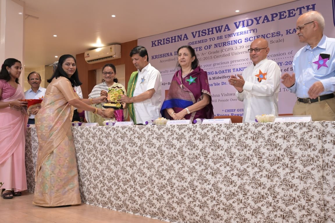 The Krishna Institute of Nursing Sciences, a constituent of Krishna Vishwa Vidyapeeth (Deemed to be University), Karad, proudly hosted the Lamp Lighting & Oath Taking Ceremony – 2024-25, marking a significant milestone for the 42nd Batch of General Nursing & Midwifery (GNM) and the 19th Batch of Bachelor of Science (Nursing) students.